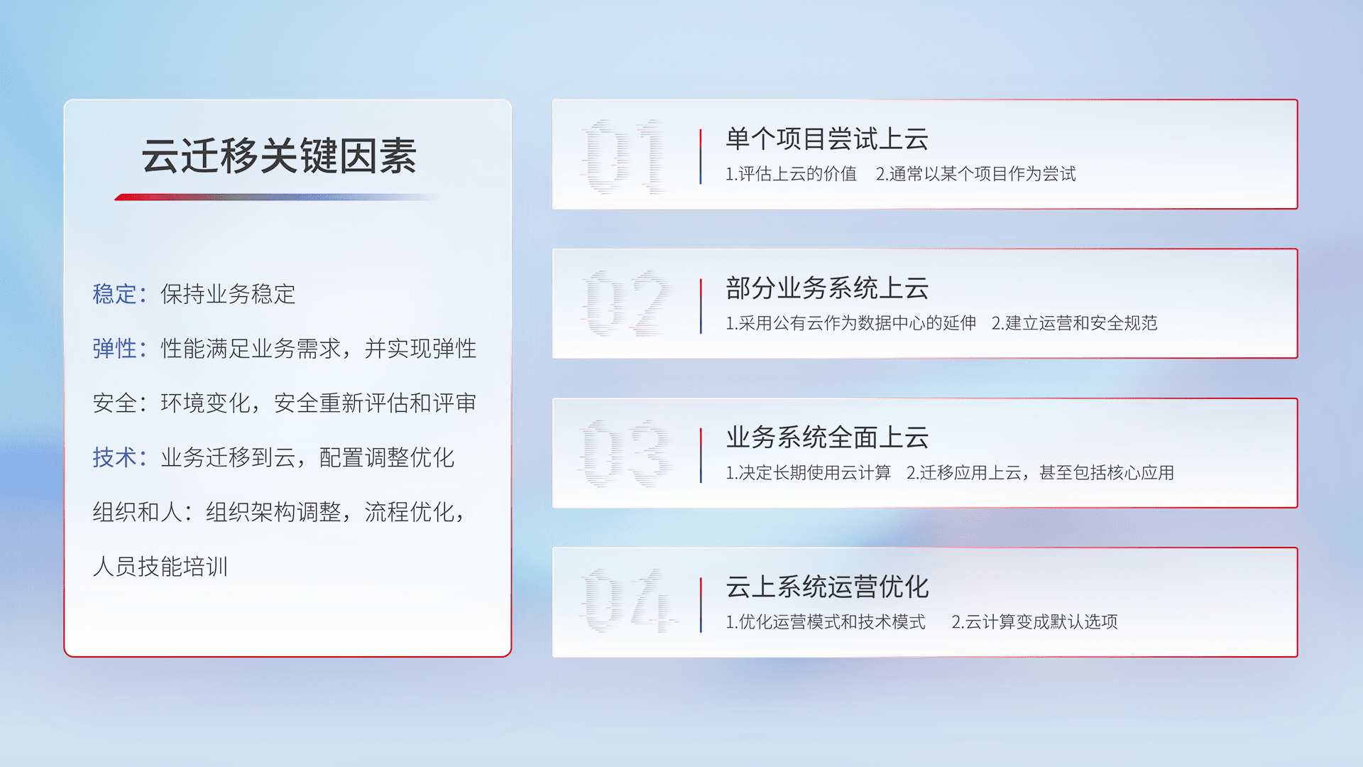 结合实际业务,,,,从规划设计、、、云平台选型、、、云原生改造、、、、数据迁移、、、、集成交付,,迁移全过程为客户识别最佳上云路径,,,做好风险识别管理,,设计网络架构、、身份权限、、、安全审计合规、、操作审计、、、、日志审计、、、监控告警策略、、、多站点容灾设计等,,,对云上基础设施进行整体规划,,,,提升IT治理水平,,以满足弹性、、、、高可用、、、高性能的需求。。。。